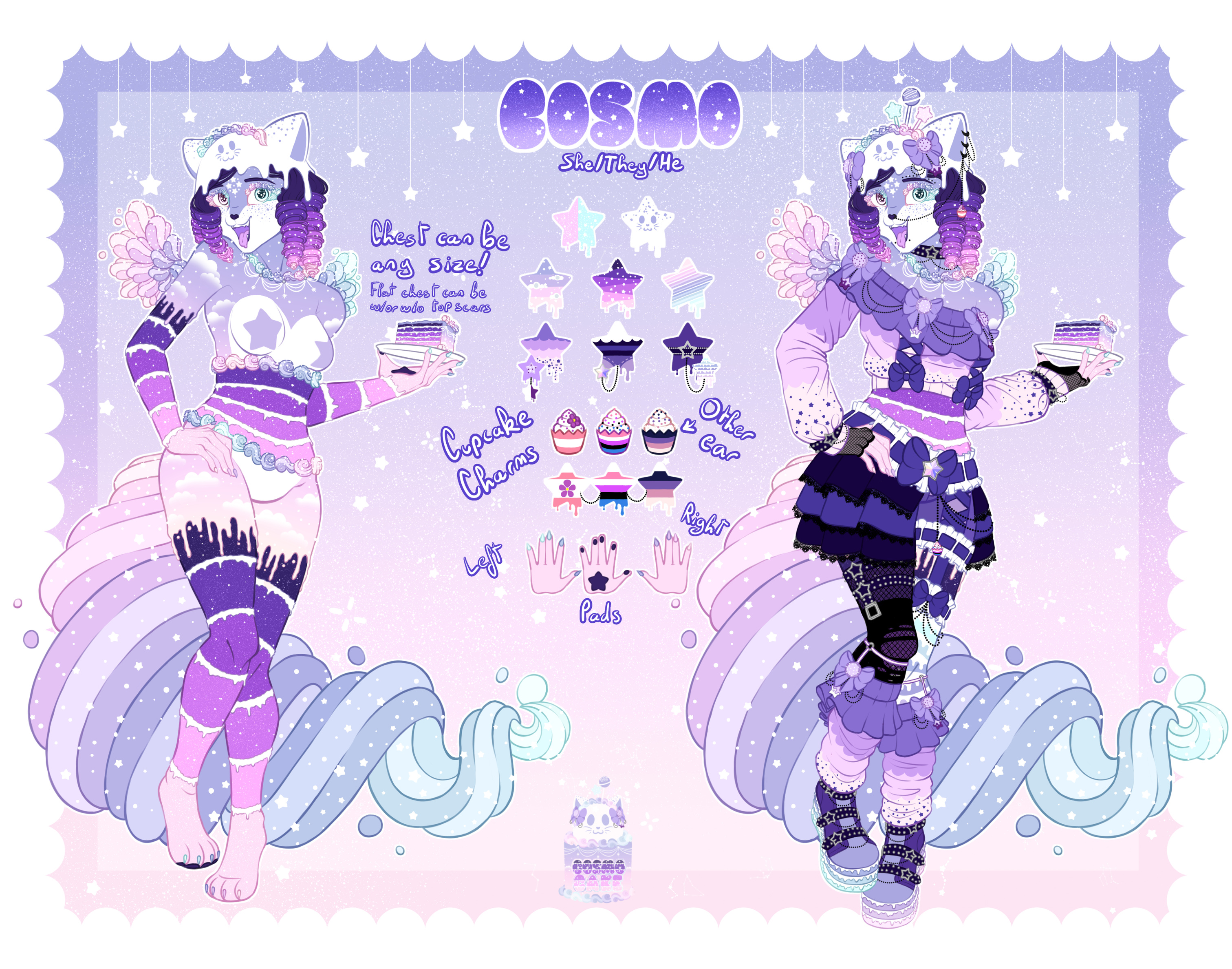 In terms of role, Cosmo is basically my mascot AND fursona! I would consider him to be a self-insert of stuff I like(Cats + pastels/black + cosmos + sweets) while also having some traits of her own